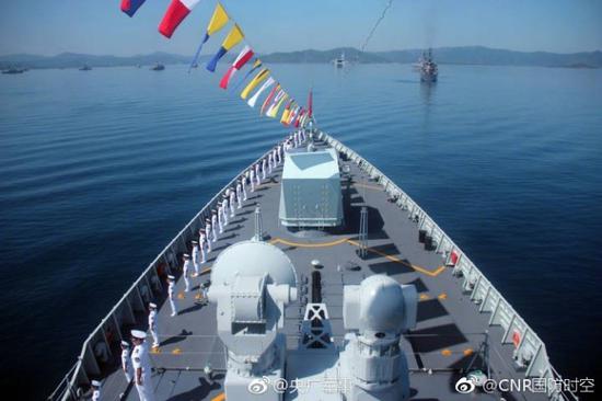 当地时间5月5日,参加"科摩多-2018"多国联合演习的中国海军舰艇编队,在印度尼西亚龙目岛附近海域指定锚地,与多国海军舰艇一道,参加了由印尼海军组织的国际海上阅舰式。上午10时许,来自34个国家的50艘舰艇按国际礼仪悬挂满旗在锚地接受检阅,中国海军导弹驱逐舰长沙舰、导弹护卫舰柳州舰代表中国海军参加阅舰式。海面上战舰林立,各国海军舰艇按照计划,组成4列纵队,参演官兵着装整齐位于各自甲板上分区列队。空中战鹰轰鸣,来自中国、法国、英国、印尼等国家的舰载直升机组成3个飞行梯队和多国海军联合组成的4个固定翼飞行梯队,整齐通过编队上空接受检阅。