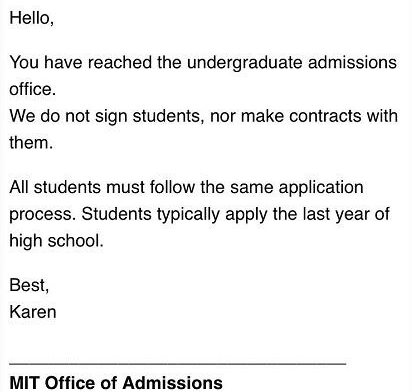 单据麻省理工学院本科生录取办公室官方了解到的消息是:麻省理工学院不存在主动去签下一个学生,或是与学生签合同的情况。所有的学生都是通过一样的程序被录取的,即在高中最后一年开始申请。(来源:环球时报)
