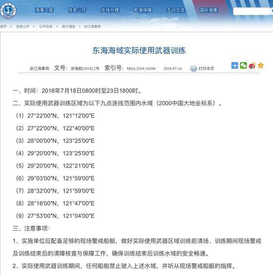 早前,浙江海事局16日发布航行警告称,2018年7月18日8时至7月23日18时,将在象山至温州以东海域组织实际使用武器训练。其中注意事项提及:"实施单位应配备足够的现场警戒船艇,做好实际使用武器区域训练前清场、训练期间现场警戒及训练结束后的清障核查与保障工作,确保训练结束后训练水域的安全畅通。"