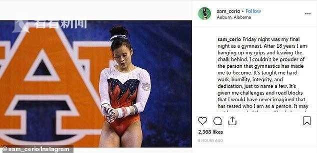 这名女子体操选手名叫萨曼莎·塞里奥,今年22岁。上周五,她代表奥本大学参加在路易斯安那州的巴吞鲁日举行的地区性体操比赛。