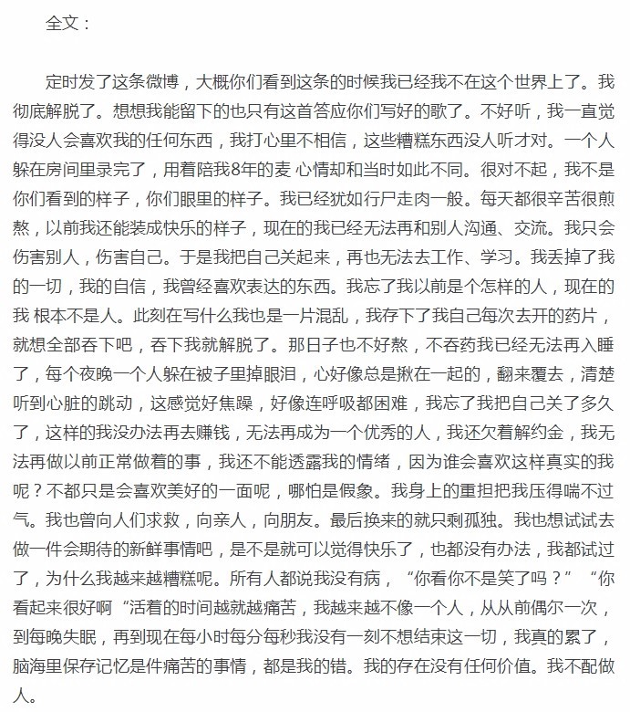 3月22日晚,BEJ48前成员张菡筱发了一条定时微博,内容负能量满满,甚至直言自己“存在没有任何价值,不配做人”,事后证明张菡筱准备吞安眠药自杀。