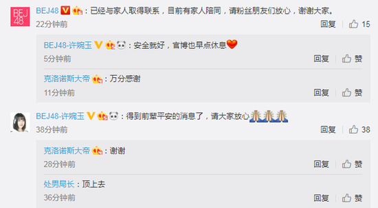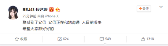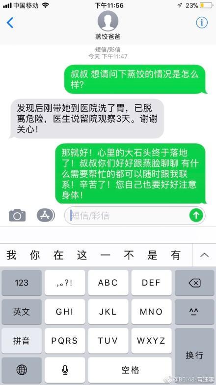 稍晚时间,BEJ48官博、成员青钰雯、段艺璇等发博证实张菡筱人已平安。而张菡筱父亲在回复短信中则称已为女儿洗胃,医生说还需留院观察3天。